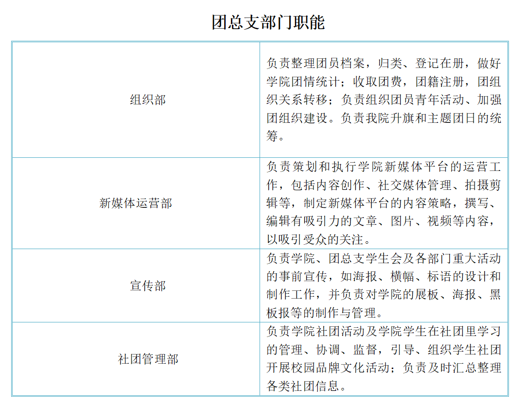 大數(shù)據(jù)與人工智能學(xué)院團(tuán)總支是在院黨委和校團(tuán)委領(lǐng)導(dǎo)下的青年團(tuán)總支部委員會的簡稱。目前團(tuán)總支委員會共有新媒體運(yùn)營部、組織部、宣傳部、社團(tuán)管理部,4個職能部門,各部門各司其職,恪盡職守。
