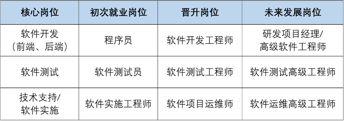 軟件技術(shù)專業(yè)畢業(yè)生具有就業(yè)面寬,工作適應(yīng)性強的特點,其就業(yè)崗位主要面向軟件開發(fā)企業(yè)、軟件外包公司、政府部門、電信、財稅、金融、證券公司、移動通訊公司等企事業(yè)單位,從事軟件開發(fā)與測試、軟件技術(shù)支持與服務(wù)、數(shù)據(jù)庫管理與維護、軟件產(chǎn)品營銷等方面的技術(shù)與管理工作。