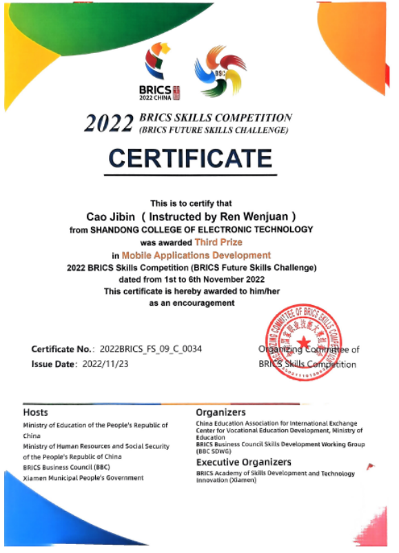 本專業(yè)自招生以來,組織學(xué)生積極參加各級各類職業(yè)技能大賽及數(shù)學(xué)建模大賽,發(fā)揮“以賽促學(xué)、以賽促教”的作用,提高學(xué)生技能水平。先后在金磚國家職業(yè)技能大賽、金磚“一帶一路”職業(yè)技能大賽、山東省職業(yè)技能大賽、山東省大學(xué)生軟件設(shè)計大賽、全國及山東省數(shù)學(xué)建模大賽、山東省“技能興魯”等賽項獲獎30余項,同時培養(yǎng)了10余名山東省齊魯工匠后備人才,人才培養(yǎng)成效取得了顯著成績。