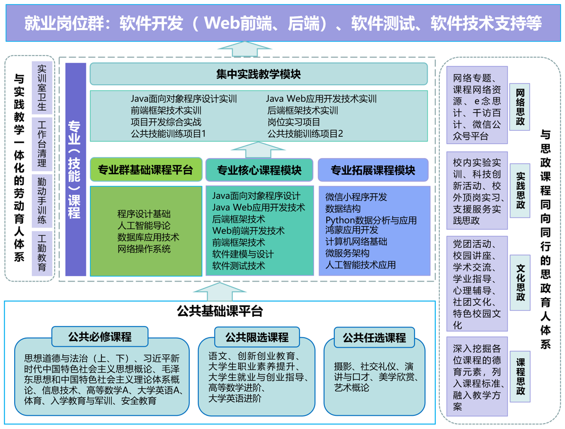 按照“平臺+模塊”的課程體系構(gòu)建思路,構(gòu)建“兩個平臺、三個融通、四個貫穿”的課程體系。“兩個平臺”是指公共基礎(chǔ)課平臺、專業(yè)群基礎(chǔ)課平臺,主要培養(yǎng)學(xué)生的核心素養(yǎng)和專業(yè)基本能力,為其將來從事不同工作崗位打下基礎(chǔ);“三個融通”是指專業(yè)崗位群與課程、職業(yè)技能等級證書、技能大賽等內(nèi)容相互融通;“四個貫穿”是指將思政教育、勞動教育、創(chuàng)新創(chuàng)業(yè)能力培養(yǎng)、學(xué)生個性發(fā)展等貫穿于整個教學(xué)過程的課程體系。