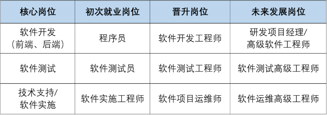 軟件技術(shù)專業(yè)畢業(yè)生具有就業(yè)面寬、工作適應(yīng)性強(qiáng)的特點(diǎn),其就業(yè)崗位主要面向軟件開發(fā)企業(yè)、政府部門,以及電信、財(cái)稅、金融、證券、移動通訊等行業(yè)的企事業(yè)單位,從事軟件開發(fā)(Web前端開發(fā)、后端開發(fā))、軟件測試、軟件技術(shù)支持與服務(wù)、數(shù)據(jù)庫管理與維護(hù)、辦公自動化、計(jì)算機(jī)系統(tǒng)管理維護(hù)、軟件產(chǎn)品營銷等方面的技術(shù)與管理工作。
