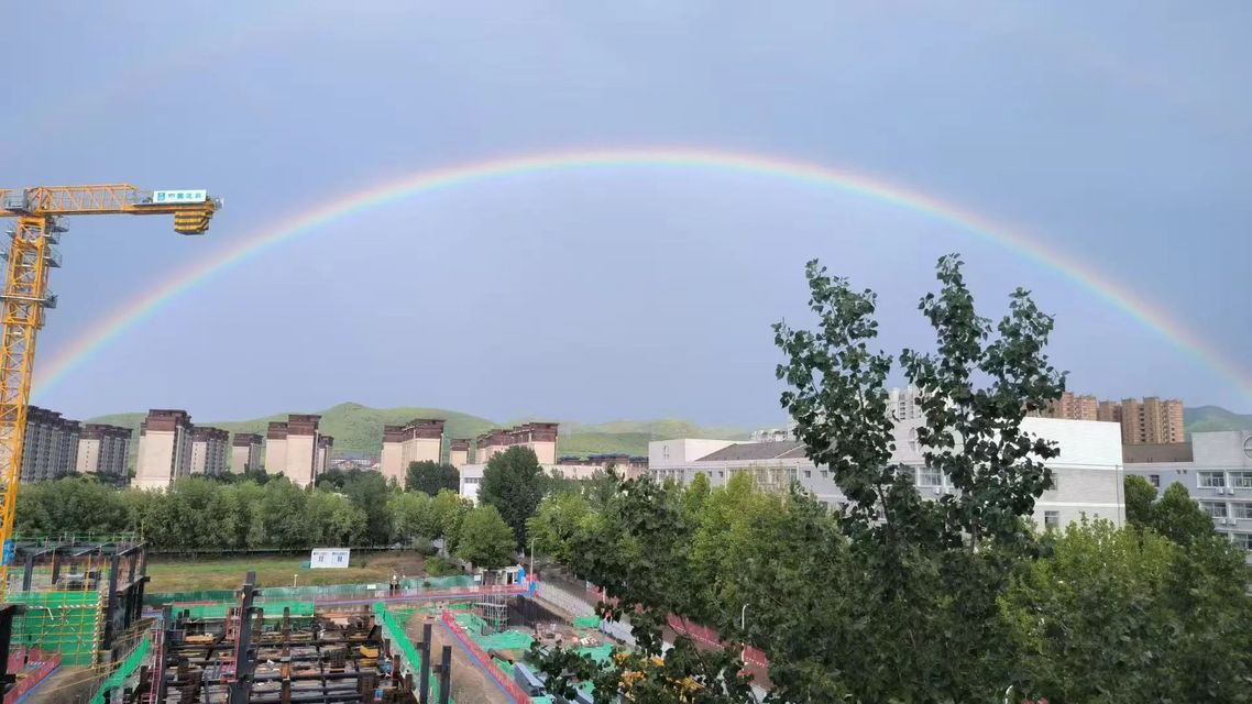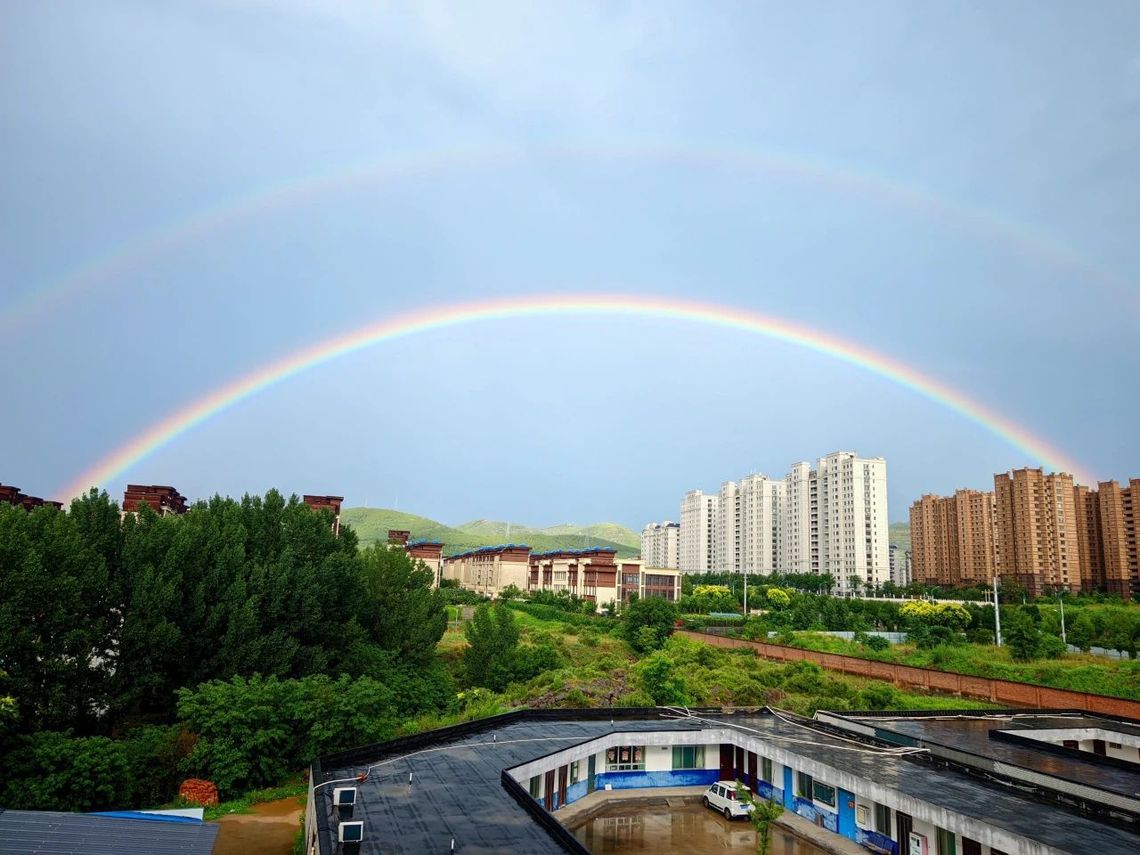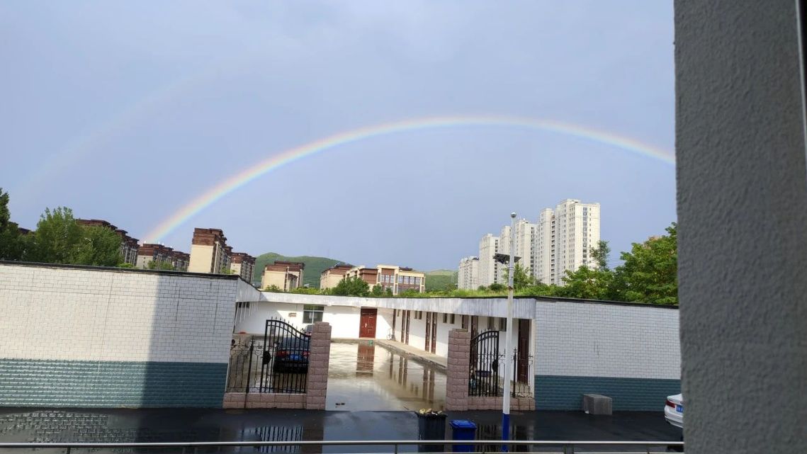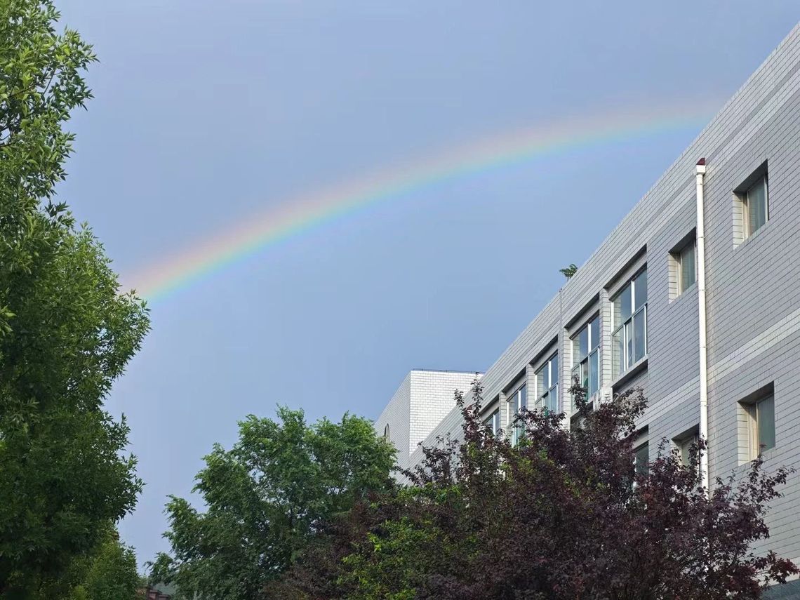 ??隨著最后一門(mén)考試結(jié)束,雨幕悄然退場(chǎng)。金紅色的夕陽(yáng)刺破云層,為濕漉漉的校園鍍上金邊。就在此時(shí)東方天空赫然出現(xiàn)兩道彩虹!主虹鮮艷奪目,副虹若隱若現(xiàn),兩道絢麗的彩虹橫跨天際,色彩斑斕,如夢(mèng)如幻,七彩光帶將整個(gè)校園包裹在夢(mèng)幻光暈里,將校園裝點(diǎn)得格外美麗。
