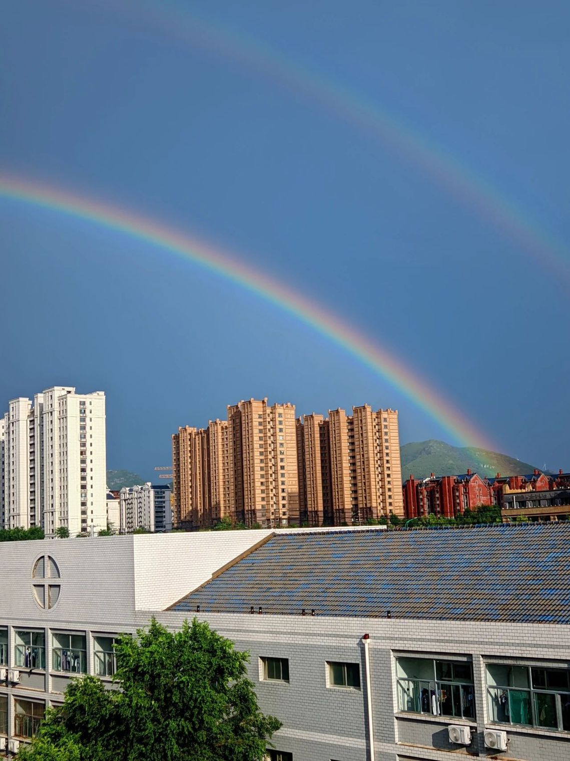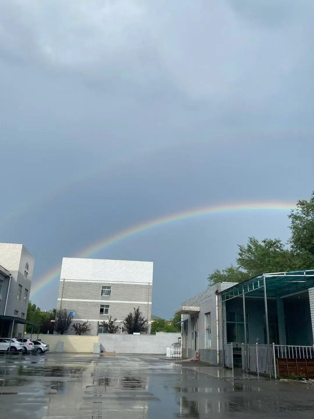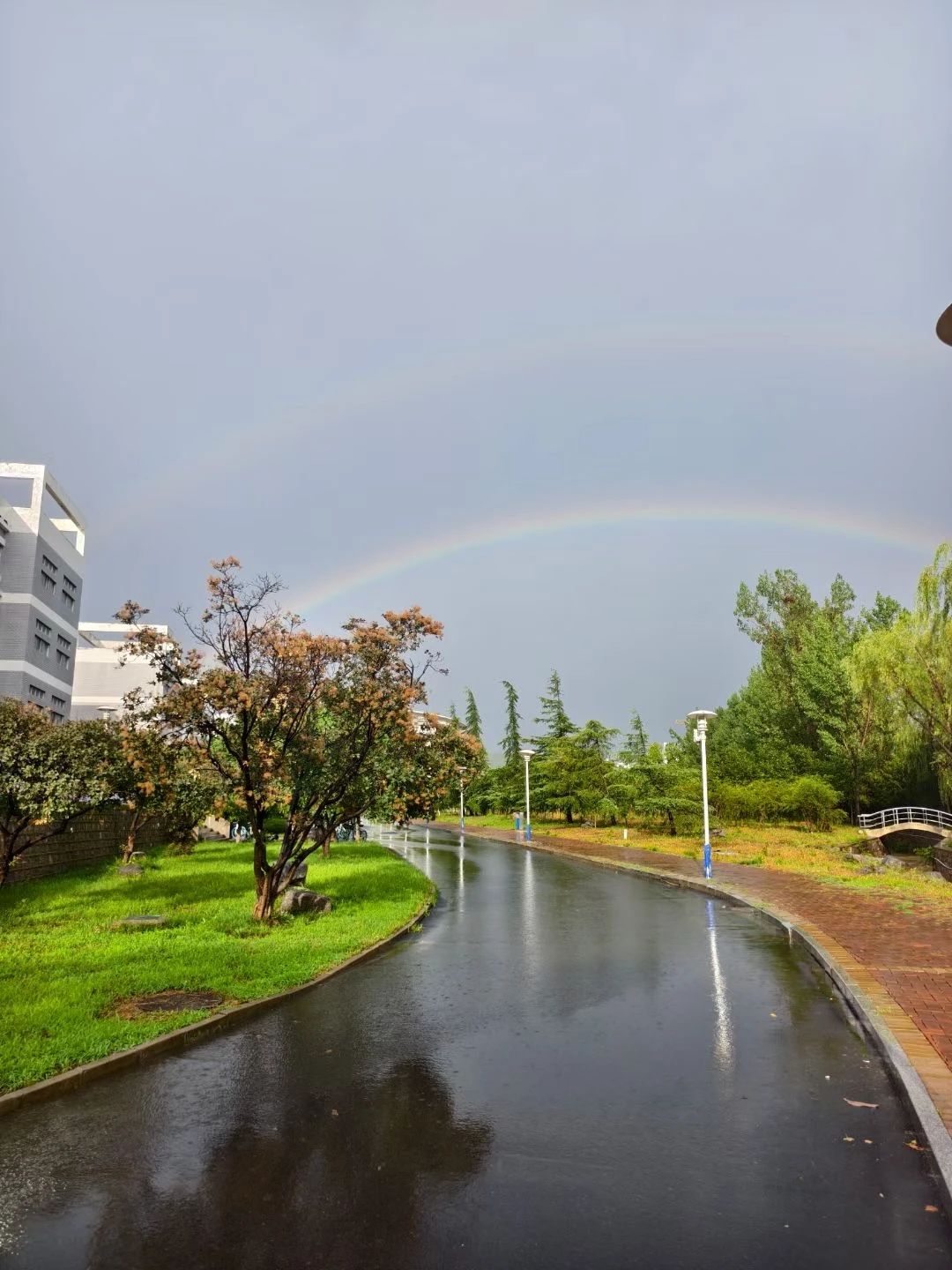 ??隨著最后一門(mén)考試結(jié)束,雨幕悄然退場(chǎng)。金紅色的夕陽(yáng)刺破云層,為濕漉漉的校園鍍上金邊。就在此時(shí)東方天空赫然出現(xiàn)兩道彩虹!主虹鮮艷奪目,副虹若隱若現(xiàn),兩道絢麗的彩虹橫跨天際,色彩斑斕,如夢(mèng)如幻,七彩光帶將整個(gè)校園包裹在夢(mèng)幻光暈里,將校園裝點(diǎn)得格外美麗。