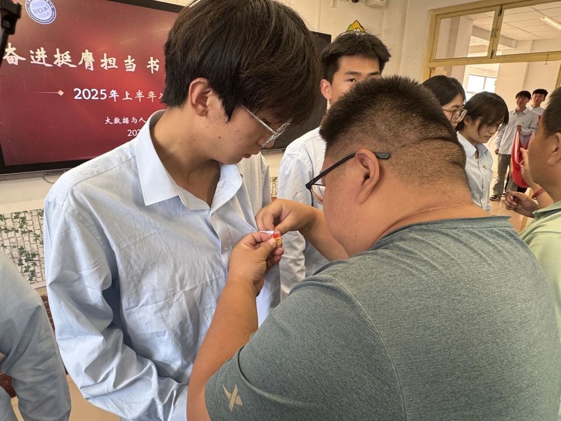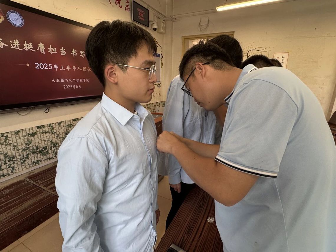 入團(tuán)儀式在莊嚴(yán)激昂的國(guó)歌聲中拉開(kāi)序幕。申玥宣讀新團(tuán)員名單,宣告一批朝氣蓬勃的學(xué)子正式加入中國(guó)共產(chǎn)主義青年團(tuán),開(kāi)啟人生新征程。在全場(chǎng)熱烈的掌聲中,李海彬書記與輔導(dǎo)員老師們親手為新團(tuán)員佩戴團(tuán)徽。閃耀的團(tuán)徽別上胸前,不僅是身份的象征,更承載著共青團(tuán)精神的薪火相傳與責(zé)任使命的傳遞。