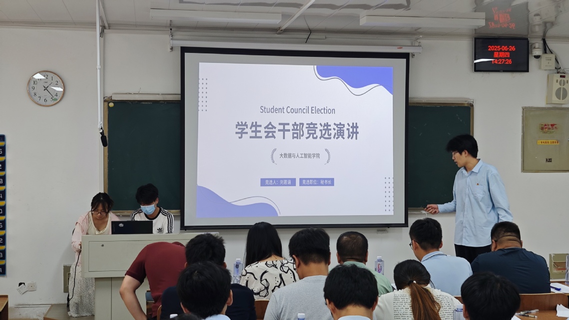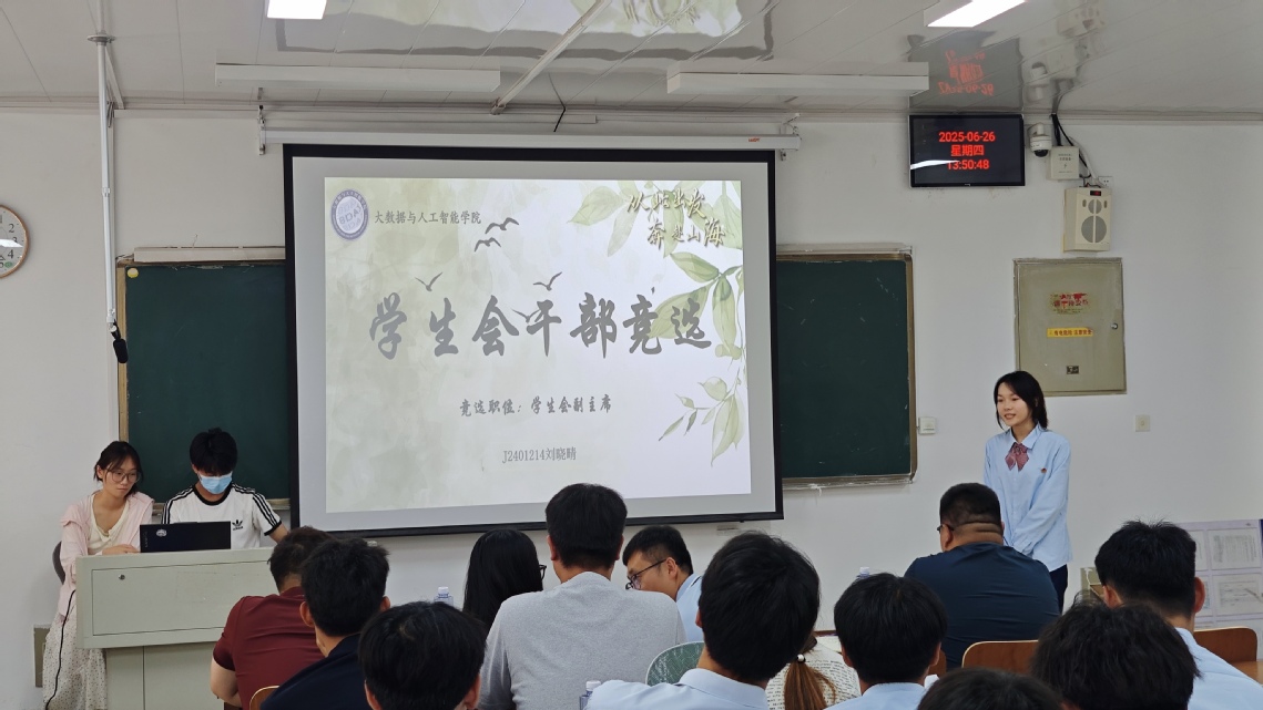 ??青春接力,使命傳承。為保障我院學生會工作的有序銜接,選拔出有能力、有擔當?shù)膶W生干部,6月26日,大數(shù)據(jù)與人工智能學院第二屆團總支學生會換屆競選答辯會在2217教室舉行。我院團總支書記李海彬、全體輔導員老師,以及第一屆團總支學生會主席團、學生骨干常委共同擔任評委,眾多懷揣熱情的同學參與競選,共同為學院學生工作注入新活力。
