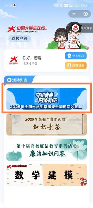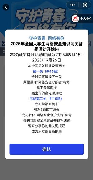 中國大學(xué)生在線推出“守護(hù)青春,網(wǎng)絡(luò)有你”2025年大學(xué)生網(wǎng)絡(luò)安全知識闖關(guān)答題,我們一起大展拳腳吧!活動時間