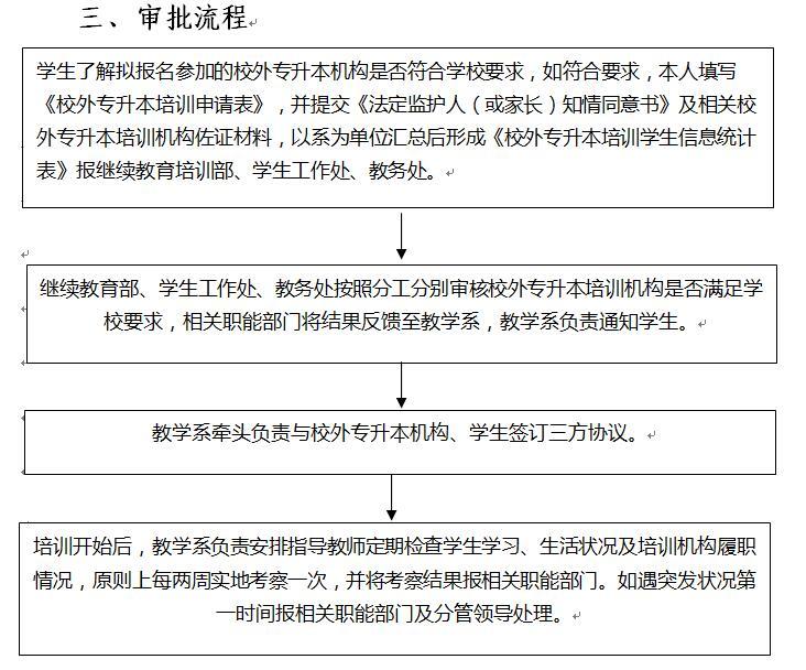 有意到符合要求的校外專升本機構參加培訓的學生,經(jīng)個人申請,法定監(jiān)護人(或家長)同意,教學系審核批準,完成三方協(xié)議簽署后,學生可在保障順利完成校內(nèi)學習任務的前提下,到校外專升本機構培訓。培訓期間,學生承諾遵守學校和培訓機構的教學、生活安排及相關管理制度。