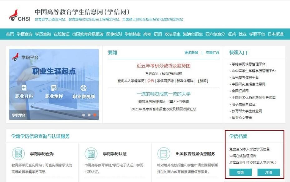 1. 登錄學(xué)信檔案。學(xué)生本人登錄中國(guó)高等教育學(xué)生信息網(wǎng)(學(xué)信網(wǎng)官網(wǎng))(http://www.chsi.com.cn/),進(jìn)入學(xué)信檔案頁(yè)面,如圖1所示。