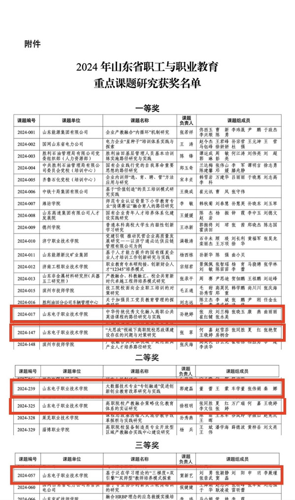 12月22日,山東省職工與職業(yè)教育協(xié)會公布了2024年山東省職工與職業(yè)教育重點課題研究結題及評選結果,我校前期立項的《中華傳統(tǒng)優(yōu)秀文化融入高職公共英語課程的路徑研究與實踐》等5項重點課題全部順利結項,研究成果分別獲評一等獎2項、二等獎2項、三等獎1項。