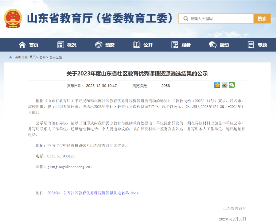根據(jù)《山東省教育廳關(guān)于開展2023年度社區(qū)教育優(yōu)秀課程資源遴選活動的通知》(魯教民函〔2023〕14號)要求,經(jīng)各市、高校申報,我廳組織專家評審,遴選出2023年度社區(qū)教育優(yōu)秀課程資源717個,現(xiàn)予以公示。公示期為2023年12月30日-2024年1月6日。