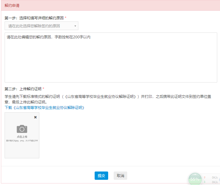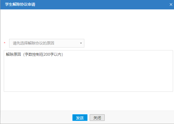 2、錄入?yún)f(xié)議解除:協(xié)議書(shū)生效后,由學(xué)生填寫(xiě)解約原因,上傳解約證明后提出解約申請(qǐng),等待學(xué)校審核結(jié)果,審核通過(guò)協(xié)議解除,審核未過(guò)協(xié)議仍有效。