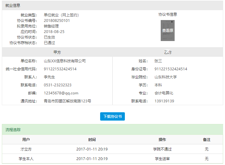 2、下載打印協(xié)議書(shū):畢業(yè)生下載打印就業(yè)信息數(shù),聯(lián)系單位蓋章簽字。