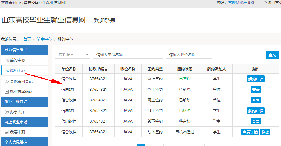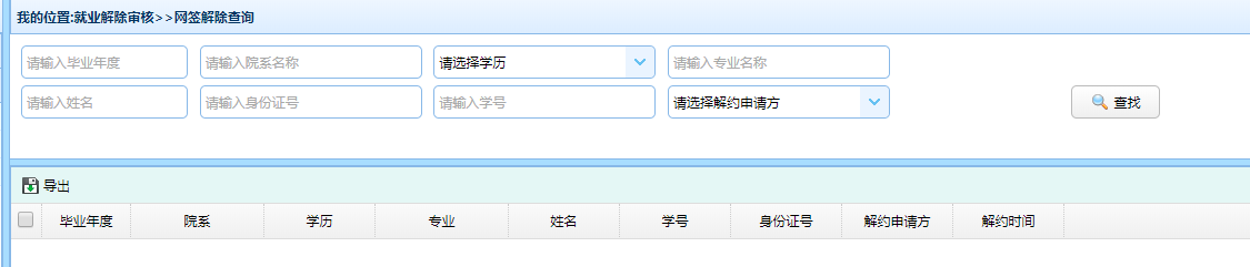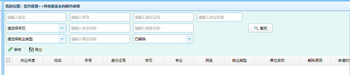 功能描述:學(xué)生錄入其他去向并且學(xué)校已經(jīng)審核入庫(kù)后,如解除去向,需學(xué)生提出解約申請(qǐng),由院系或?qū)W校解除審核。