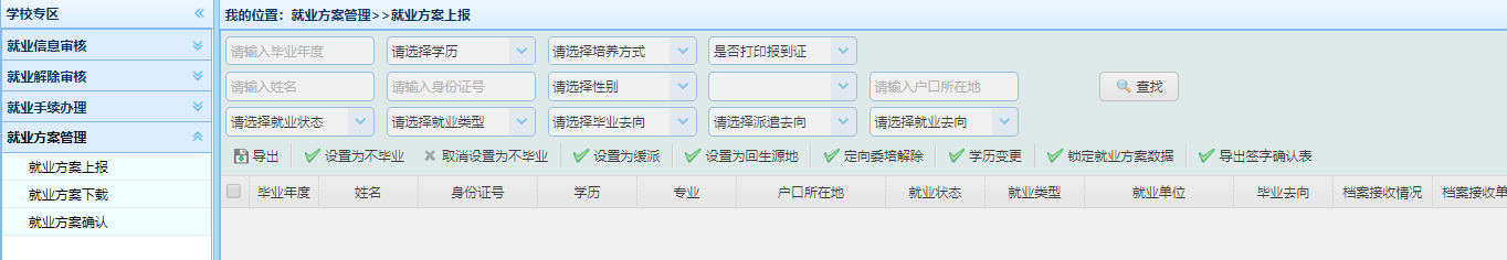 功能描述:實(shí)現(xiàn)高校對(duì)本校畢業(yè)生審核入庫(kù)就業(yè)方案信息管理維護(hù)。包括查詢(xún)、導(dǎo)出、設(shè)置不畢業(yè)、設(shè)置緩派、解除定向委培關(guān)系等功能操作。