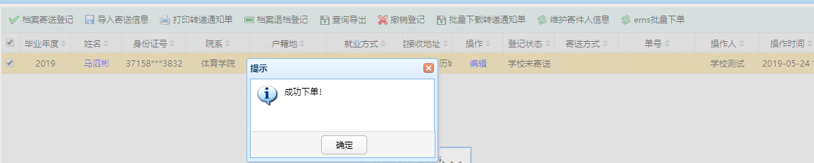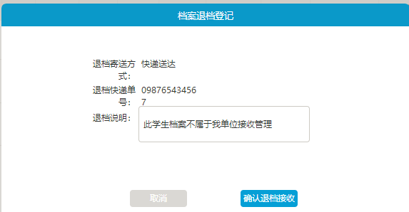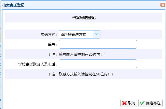 1、檔案寄送登記:選中學(xué)生記錄,點(diǎn)擊“檔案寄送登記”按鈕,彈出界面錄入寄送信息,確認(rèn)寄送。信息登記后,學(xué)生即可在線(xiàn)查詢(xún)寄送情況。可如果誤操作,可通過(guò)處理。