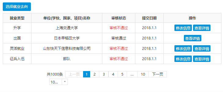 功能描述:實(shí)現(xiàn)省內(nèi)院校畢業(yè)生簽訂就業(yè)協(xié)議之外的畢業(yè)去向信息登記功能。包括勞動(dòng)合同就業(yè)、靈活就業(yè)、升學(xué)、出國(guó)、自主創(chuàng)業(yè)、應(yīng)征入伍和基層項(xiàng)目就業(yè)七種去向。