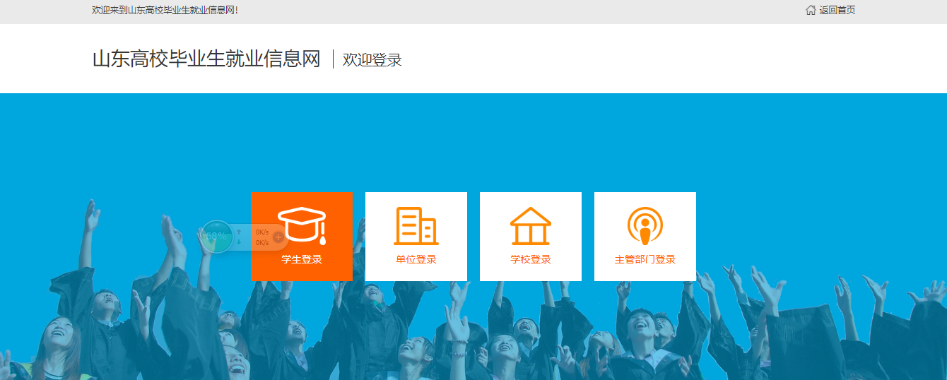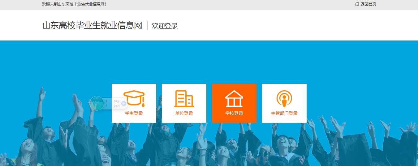 登錄山東高校畢業(yè)生就業(yè)信息網(wǎng)(http://www.sdgxbys.cn),點(diǎn)擊“登錄|注冊(cè)”按鈕,進(jìn)入用戶(hù)界面,選擇學(xué)校用戶(hù),輸入系統(tǒng)分配的用戶(hù)名和密碼登錄。