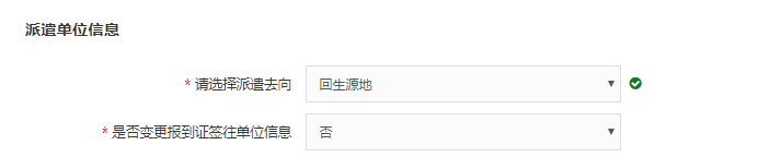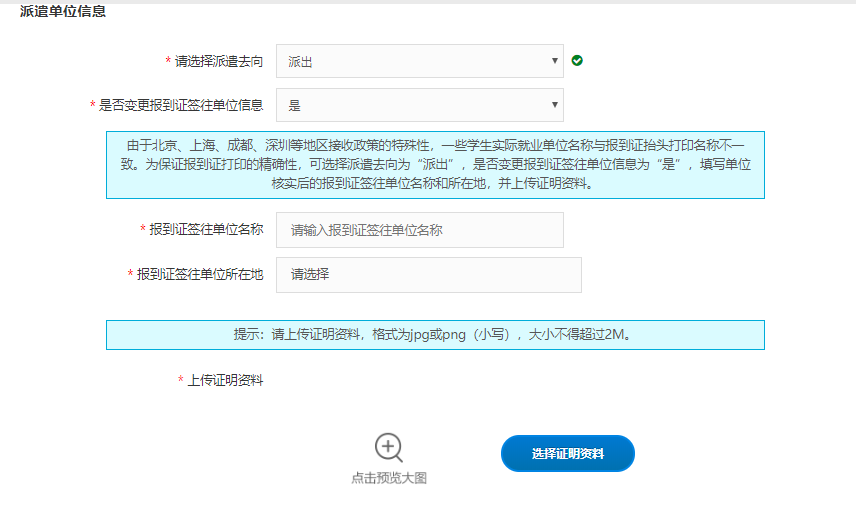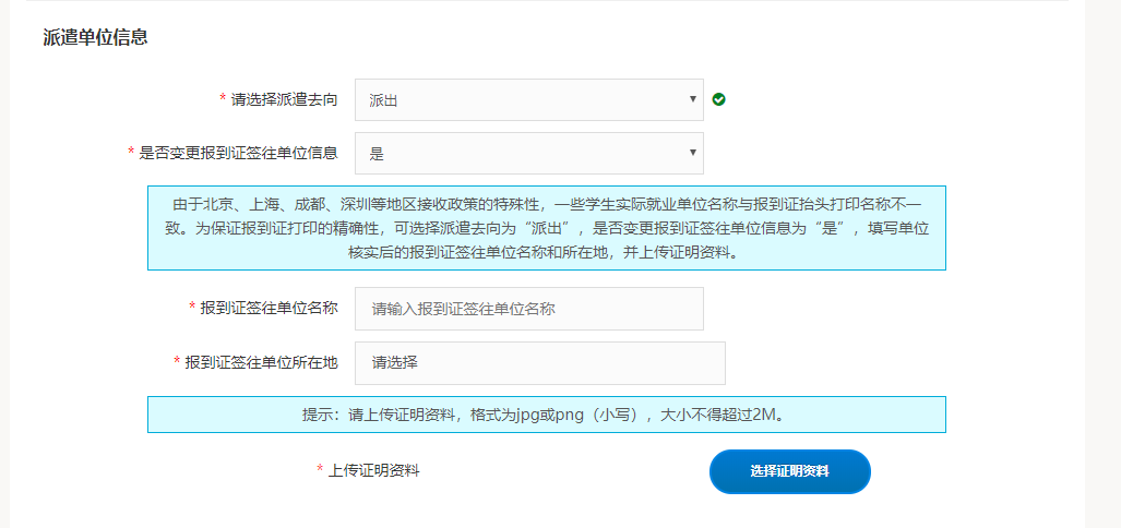(1)派出:如果報(bào)到證派遣到單位,則派遣去向選則派出。特殊情況下,可變更報(bào)到證簽往單位名稱(chēng)和所在地,需上傳證明資料。