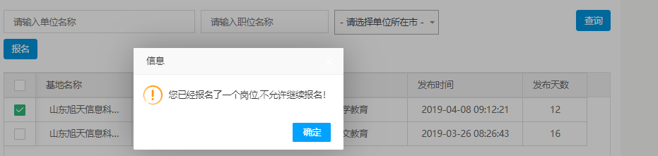 學(xué)生只能選中一個(gè)崗位報(bào)名,撤銷(xiāo)后可重新選中報(bào)名。
