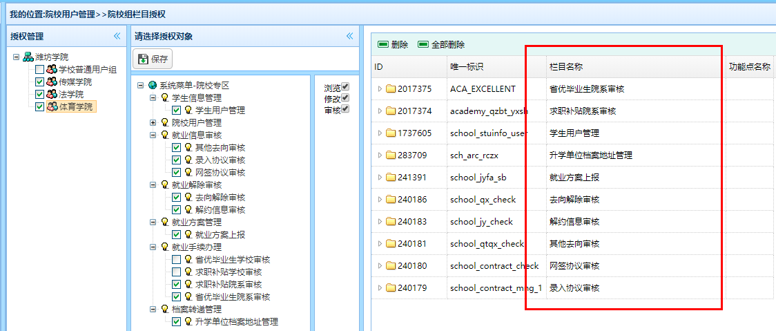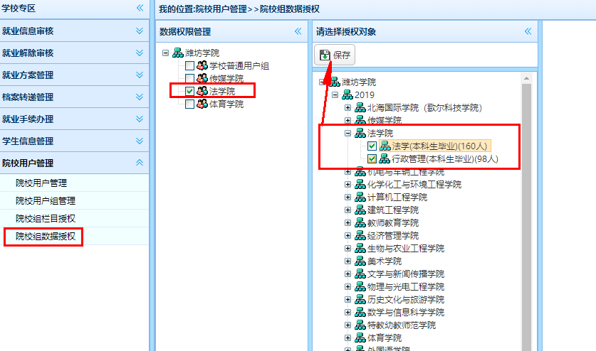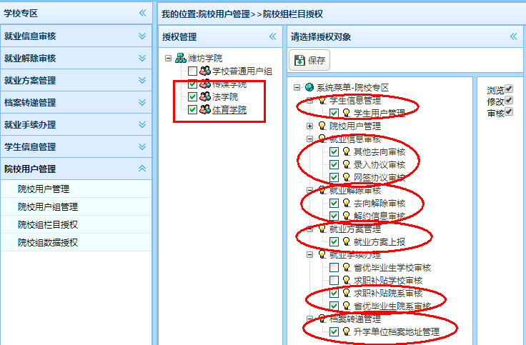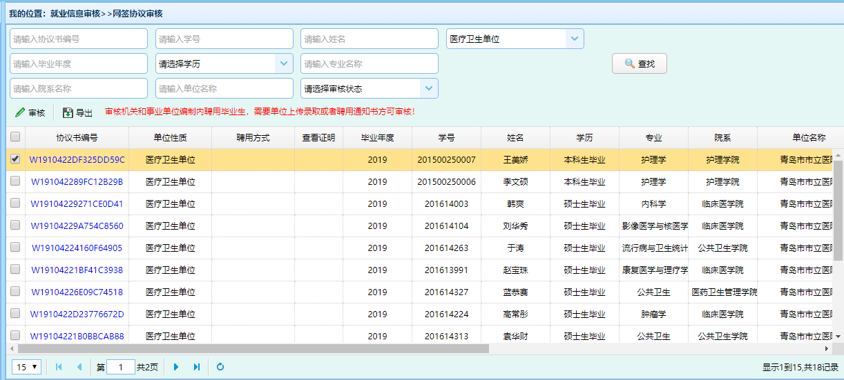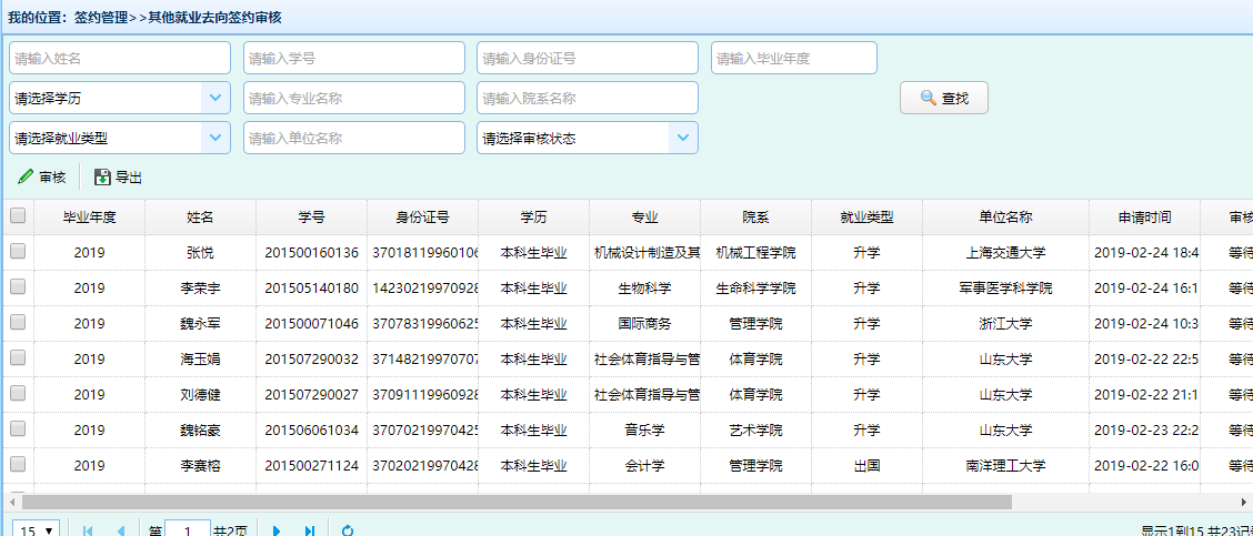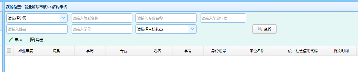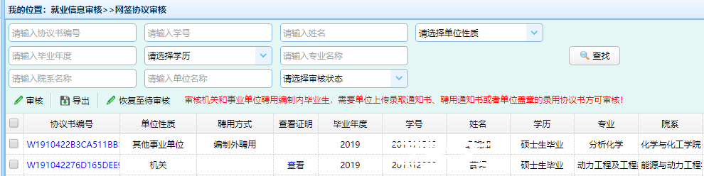 功能描述:院系或?qū)W校級(jí)就業(yè)負(fù)責(zé)人對(duì)本院系或?qū)W校畢業(yè)生離校前網(wǎng)簽協(xié)議信息審核入庫(kù)。
