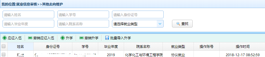 功能描述:對(duì)本校畢業(yè)生離校前登記合同就業(yè)、靈活就業(yè)、升學(xué)等七種去向信息審核入庫(kù)。