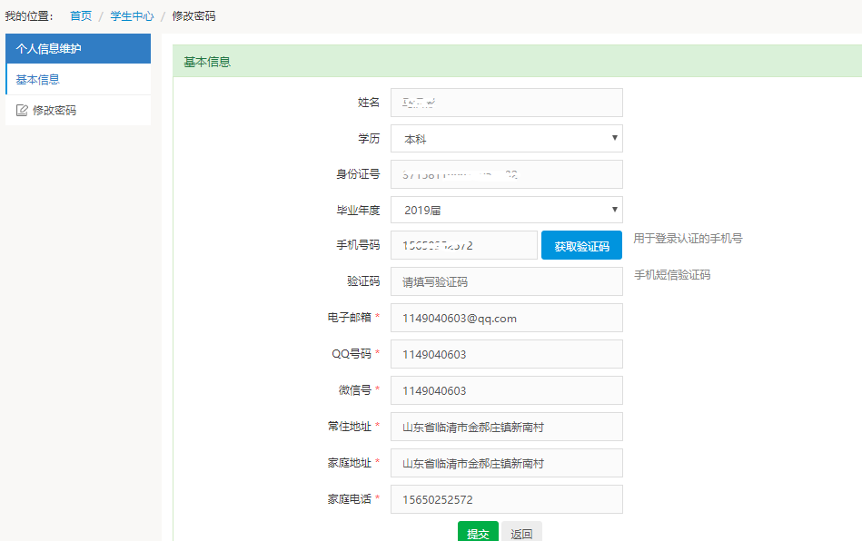 功能操作:高校畢業(yè)生用山東高校畢業(yè)生就業(yè)信息網(wǎng)注冊(cè)賬號(hào)登錄系統(tǒng),選擇個(gè)人信息維護(hù)模塊下“基本信息”欄目。可修改系統(tǒng)允許編輯的內(nèi)容。