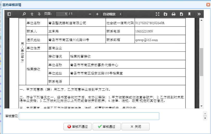 功能,查看協(xié)議內(nèi)容,信息正確則審核通過(guò),信息有問(wèn)題審核不通過(guò),并填寫(xiě)審核不通過(guò)的原因。