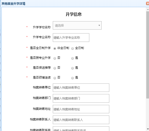 升學(xué):由院系或?qū)W校對(duì)待就業(yè)類(lèi)型畢業(yè)生填寫(xiě)升學(xué)信息。保存后畢業(yè)生就業(yè)信息入庫(kù)。填寫(xiě)時(shí)注意非全日制研究生可不填寫(xiě)檔案轉(zhuǎn)寄信息。全日制要求必填。
