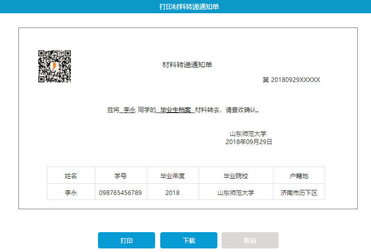 3、打印轉(zhuǎn)寄通知單:可以在線(xiàn)打印檔案轉(zhuǎn)遞通知單,粘貼到檔案封皮,便于接收檔案單位查閱。也可通過(guò)批量下載。