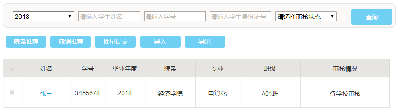 1、院系審核:院校收到畢業(yè)生提交的申請(qǐng)信息后,點(diǎn)擊姓名,查看信息。核實(shí)準(zhǔn)確后審核通過(guò),推薦到學(xué)校審核。