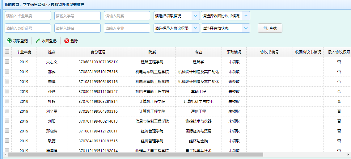 功能描述:實(shí)現(xiàn)學(xué)校發(fā)放省外協(xié)議書(shū)的領(lǐng)取登記和回收情況登記。根據(jù)登記結(jié)果系統(tǒng)控制學(xué)生網(wǎng)簽功能。