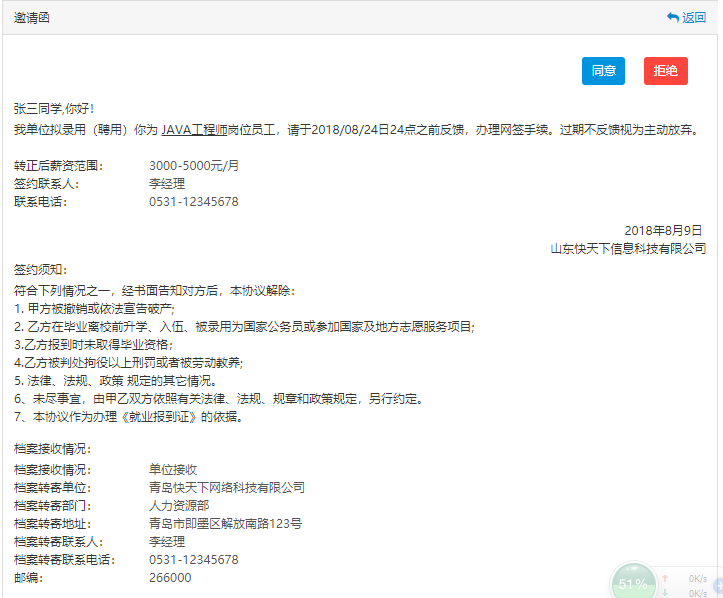 1、接收邀請(qǐng)函。畢業(yè)生收到單位發(fā)送的簽約邀請(qǐng)后,查看邀請(qǐng)內(nèi)容,進(jìn)行回復(fù)。回復(fù)同意即生成協(xié)議書(shū),回復(fù)拒絕則邀請(qǐng)函無(wú)效。