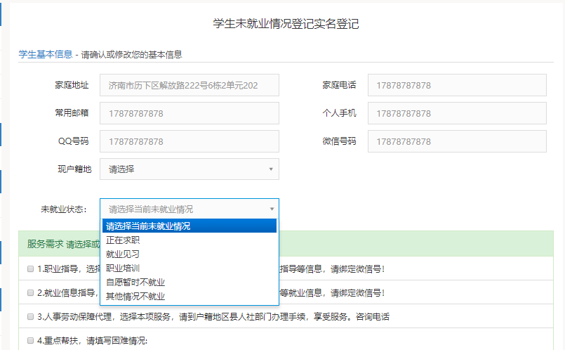 高校畢業(yè)生用山東高校畢業(yè)生就業(yè)信息網(wǎng)注冊(cè)賬號(hào)登錄系統(tǒng),選擇未就業(yè)實(shí)名登記見(jiàn)習(xí)模塊下“省內(nèi)院校畢業(yè)生登記”欄目,右側(cè)顯示填寫(xiě)界面,包括學(xué)生基本信息、未就業(yè)狀態(tài)和服務(wù)需求。根據(jù)不同狀態(tài),填寫(xiě)相應(yīng)內(nèi)容。便于后期戶(hù)籍地人社部門(mén)跟蹤服務(wù)。