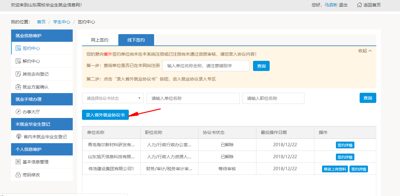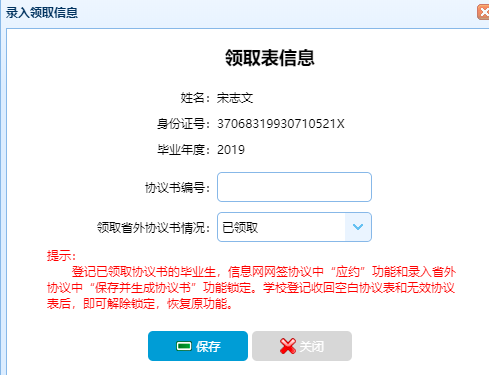 (2)如果學(xué)生交回或確認(rèn)是單位蓋章的有效協(xié)議書(shū)表,登記“收回空白協(xié)議表”后,學(xué)生被限制的錄入?yún)f(xié)議書(shū)功能打開(kāi),學(xué)生可以錄入簽約信息。