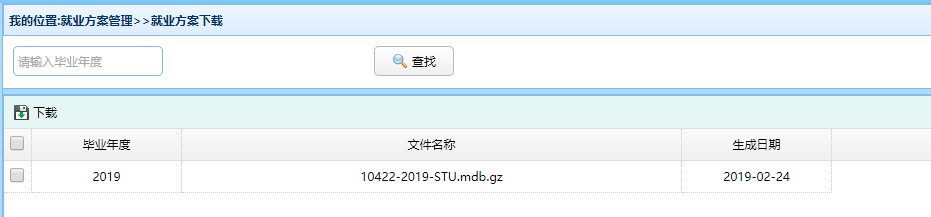 功能描述:系統(tǒng)每天定期生成各年度畢業(yè)生就業(yè)方案下載文件,便于高校下載使用。