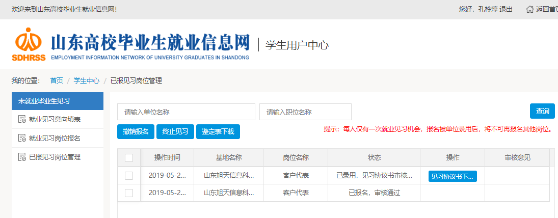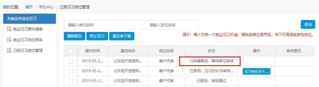功能操作:點(diǎn)擊已報(bào)見(jiàn)習(xí)崗位管理欄目,右側(cè)顯示報(bào)名崗位的操作記錄。