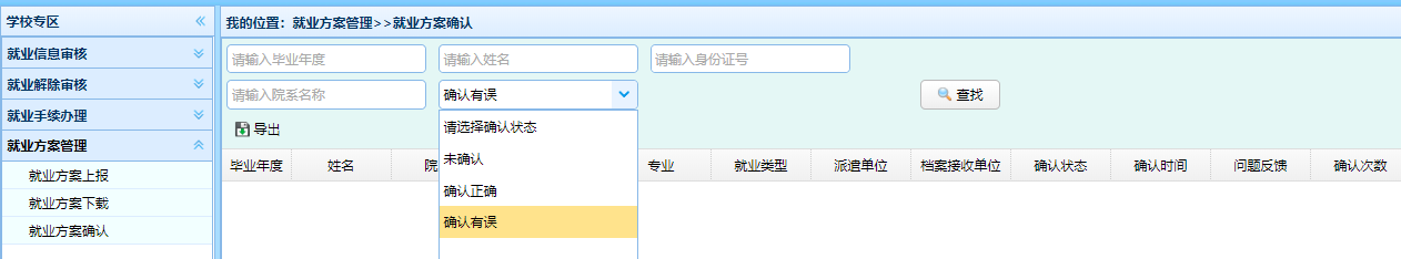 功能操作:學(xué)校可根據(jù)確認(rèn)狀態(tài)掌握學(xué)生網(wǎng)上就業(yè)確認(rèn)的情況,也可導(dǎo)出確認(rèn)情況表。