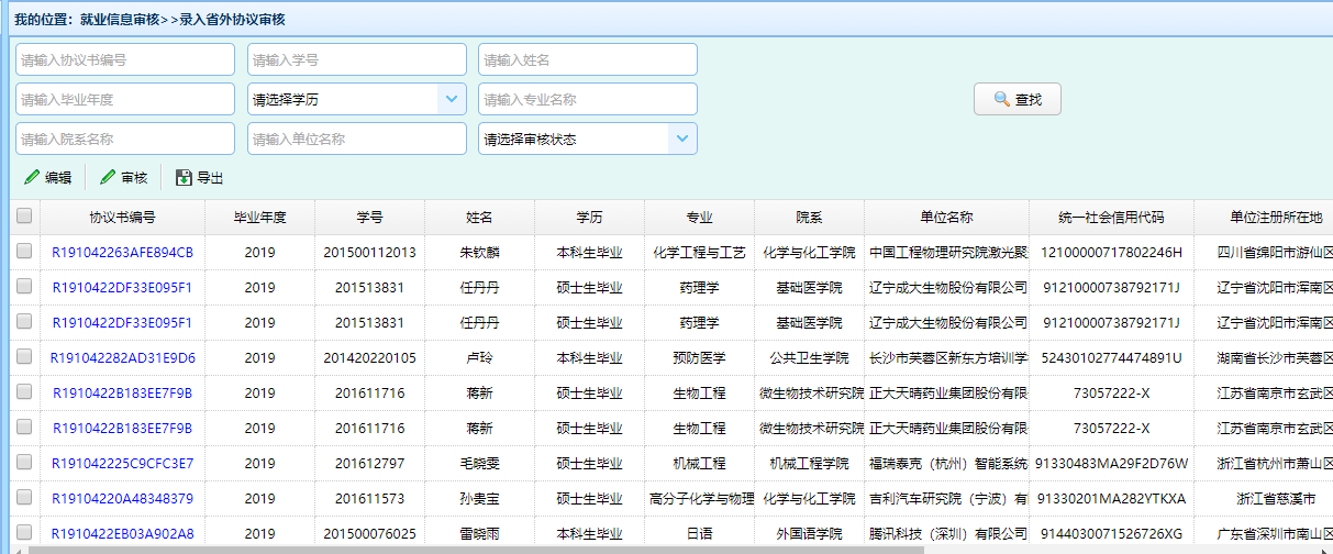 功能描述:院系或?qū)W校級(jí)就業(yè)負(fù)責(zé)人對(duì)本院系或?qū)W校畢業(yè)生錄入省外就業(yè)協(xié)議信息審核入庫(kù)。