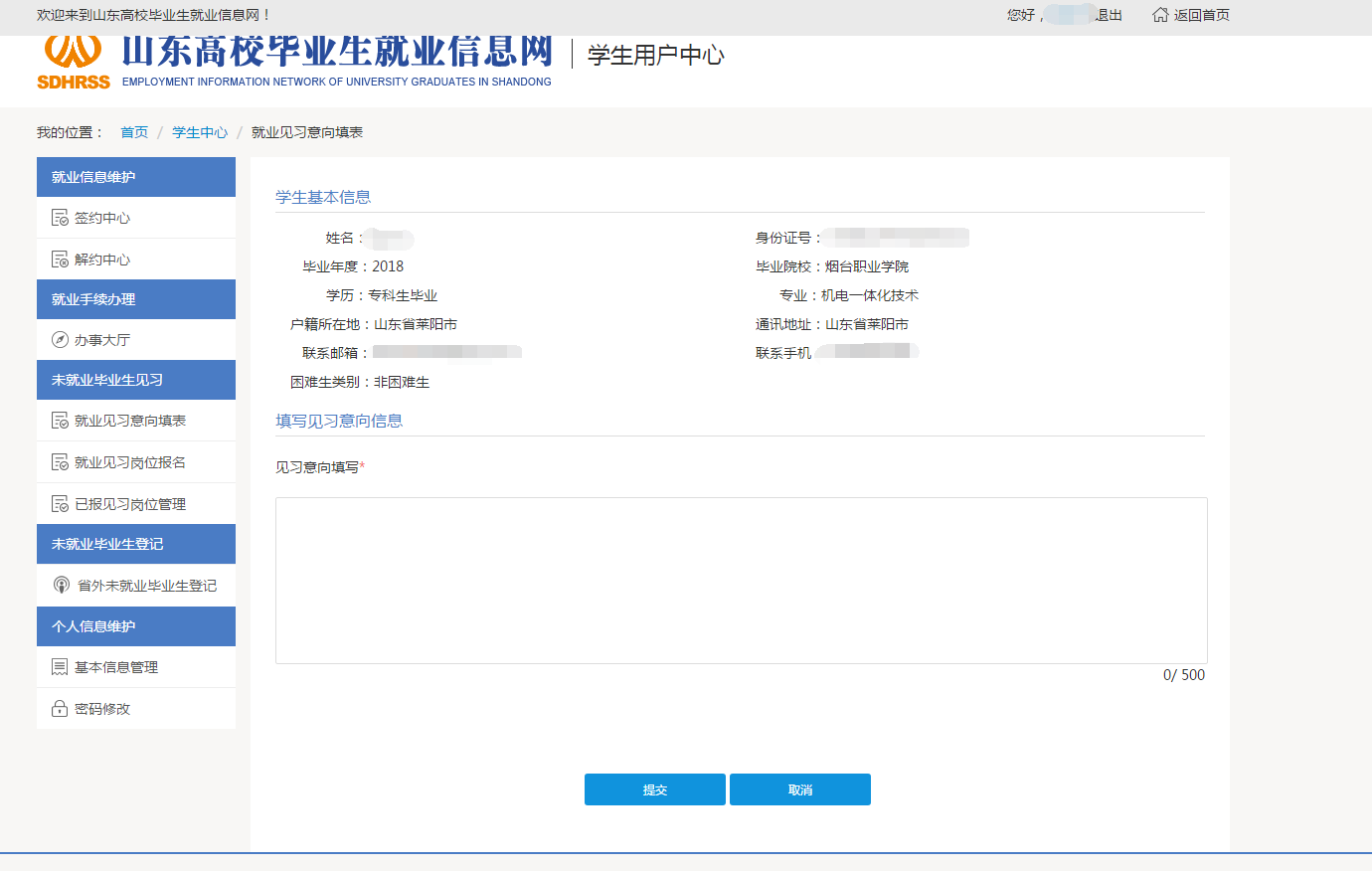 高校畢業(yè)生用山東高校畢業(yè)生就業(yè)信息網(wǎng)注冊(cè)賬號(hào)登錄系統(tǒng),選擇未就業(yè)畢業(yè)生見(jiàn)習(xí)模塊下“就業(yè)見(jiàn)習(xí)意向填表”欄目,右側(cè)顯示填寫(xiě)界面,包括學(xué)生基本信息、見(jiàn)習(xí)意向信息。其中,學(xué)生基本信息從生源信息庫(kù)讀取不可編輯,信息填寫(xiě)完成后提交系統(tǒng)。