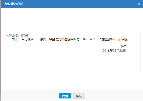 (2)單位提出解約申請(qǐng):學(xué)生收到單位解約通知,同意回復(fù)即完成解約,取消則協(xié)議繼續(xù)有效。