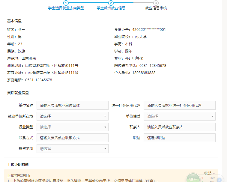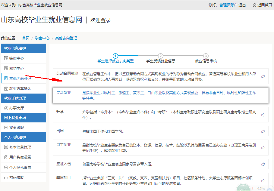 操作說(shuō)明:學(xué)生如果與單位靈活就業(yè)方式就業(yè),則選擇選擇靈活就業(yè)類(lèi)型,在界面按要求填寫(xiě)靈活就業(yè)信息并上傳證明材料。如有不確定信息可,確認(rèn)無(wú)誤信息可