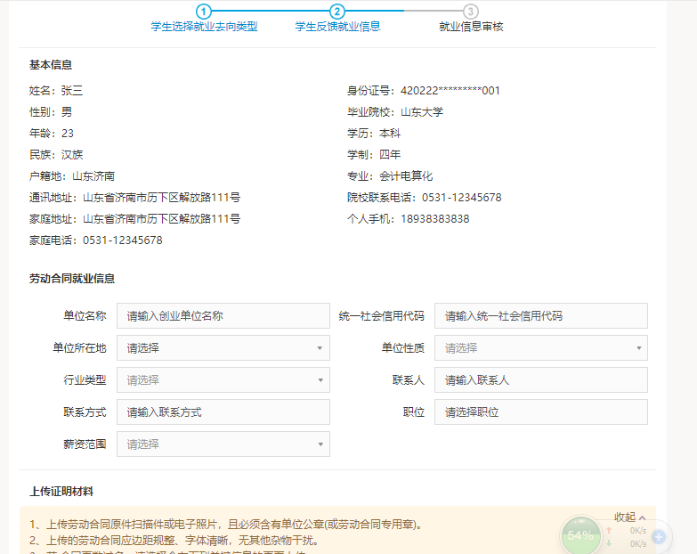 操作說(shuō)明:學(xué)生如果與單位簽訂合同方式就業(yè),則選擇選擇勞動(dòng)合同就業(yè)類(lèi)型,在界面按要求填寫(xiě)勞動(dòng)合同就業(yè)信息并上傳證明材料。如有不確定信息可,確認(rèn)無(wú)誤信息可