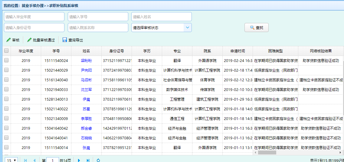 功能描述:實(shí)現(xiàn)學(xué)生填寫(xiě)的求職補(bǔ)貼申請(qǐng)表的院系審核和學(xué)校級(jí)審核。