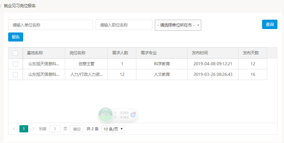 功能描述:實(shí)現(xiàn)填寫(xiě)就業(yè)意向信息登記的高校畢業(yè)生選擇見(jiàn)習(xí)崗位報(bào)名。