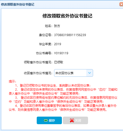 收回登記:根據(jù)學(xué)生交回的協(xié)議書(shū)情況進(jìn)行登記,收回登記后,信息網(wǎng)網(wǎng)簽協(xié)議中“應(yīng)約”功能和錄入省外協(xié)議中“保存并生成協(xié)議書(shū)”功能進(jìn)行調(diào)整。