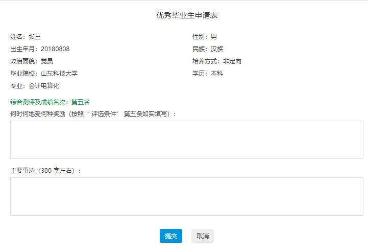 功能描述:實(shí)現(xiàn)山東省內(nèi)院校畢業(yè)生《優(yōu)秀畢業(yè)生評(píng)審表》內(nèi)容填寫(xiě)功能。