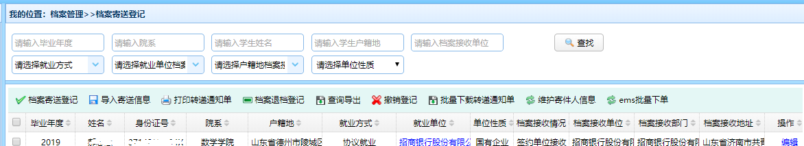 功能描述:畢業(yè)生離校后檔案信息管理維護(hù)和寄送信息登記。