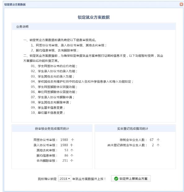 6、上報(bào)就業(yè)方案:高校審核本校畢業(yè)生整體就業(yè)方案后,在要求時(shí)間內(nèi)通過(guò)功能,完成方案上報(bào)。上報(bào)前,系統(tǒng)檢查就業(yè)信息審核情況和實(shí)名登記情況。上報(bào)后,系統(tǒng)鎖限制網(wǎng)簽協(xié)議、錄入?yún)f(xié)議和其他去向登記以及解約功能,派遣打證完畢解鎖恢復(fù)限制功能。