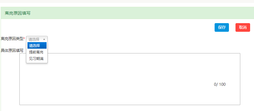 終止見(jiàn)習(xí):見(jiàn)習(xí)人員上崗后,提前離崗或期滿(mǎn)離崗需要登記信息。選擇離崗原因,如有具體原因可填寫(xiě)。
