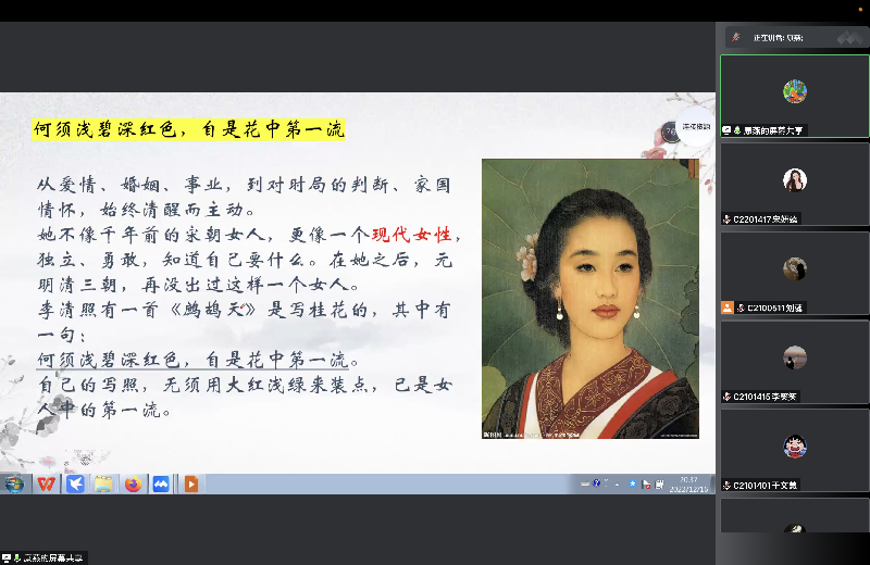 伴隨著《知否,知否》婉轉悠長的旋律和動人的歌聲,康老師開啟了“詩詞鑒賞線上特色課程——巾幗詞人李清照”的講授。